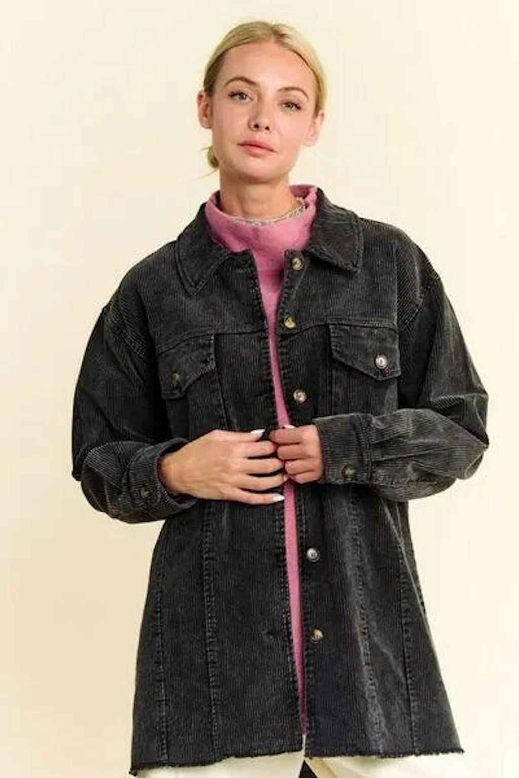 Davi & Dani Washed Corduroy Raw Hem Button Up Jacket
