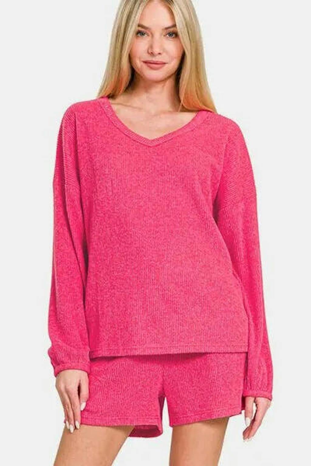 Zenana V-Neck Long Sleeve Ribbed Top and Shorts Set